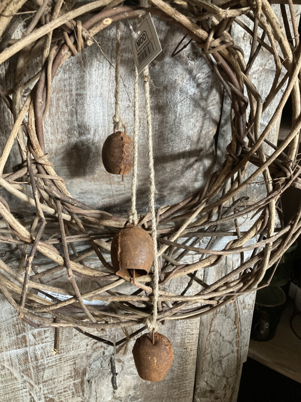 3 ijzeren belletjes aan een touw , leuk voor aan een krans, aan een pot of mooi in een schaal . Je kunt er alle kanten mee op .